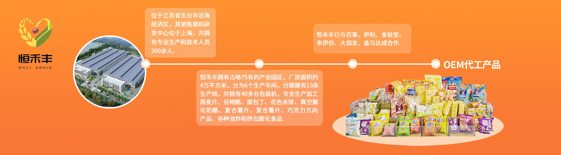目前,恒禾豐擁有占地75畝的產(chǎn)業(yè)園區(qū),廠房面積約4萬(wàn)平方米,分為6個(gè)生產(chǎn)車間,分期建有13條生產(chǎn)線,并擁有40多臺(tái)包裝機(jī),專業(yè)生產(chǎn)加工燕麥片、谷物脆、面包丁、花色米餅、低溫真空膨化奶酪及果蔬、各種油炸和擠出膨化食品。